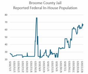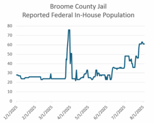 Consider my county, Broome Count, which regularly has the distinction of having the highest incarceration rate of all NYS counties and has housed in the last year hundreds of detainees for ICE. In March 2025 Sheriff Frederick Akshar signed a 287g Warrant Model contract. Yet this had little to do with caging ICE detainees. As the Sheriff tells all who will listen, his 287g agreement has not authorized or trained his officers to carry out ICE captures or even house ICE detainees—it only authorizes his officers to serve warrants to persons in the jail. Indeed the incarceration of ICE detainees is not new, but has long taken place under a 2002 contract the County signed, like many other counties, with the U.S. Mashall Service to incarcerate persons for the federal government. The current number of persons held for the federal government is spectacular. In past years there have been 5 or 6 people in the jail on federal charges on any given day. This number is now running close to 80 daily, a surge composed of ICE detainees often held for only a few days. We don’t actually know the numbers much less the names of ICE detainees, they like so much of ICE and jail operations aren’t revealed.