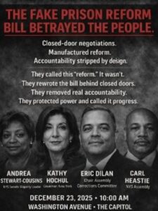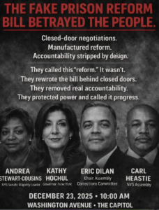 These actions followed a pattern however: the Governor has in recent years rolled back bail reform three times, rejected parole reforms, and weakened controls on solitary confinement. State lawmakers and reform activists who had worked long and hard to pass reform bills were outraged and publicly denounced the reversals. Noting Hochul’s call for the resignation of U.S. Department of Homeland Security Secretary Kristi Noem following the fatal ICE shootings in Minneapolis, a new campaign has started demanding she fire her man who oversaw the killings in NYS prisons, Daniel Martuscello III, the Commissioner of the State Department of Corrections and Community Supervision.